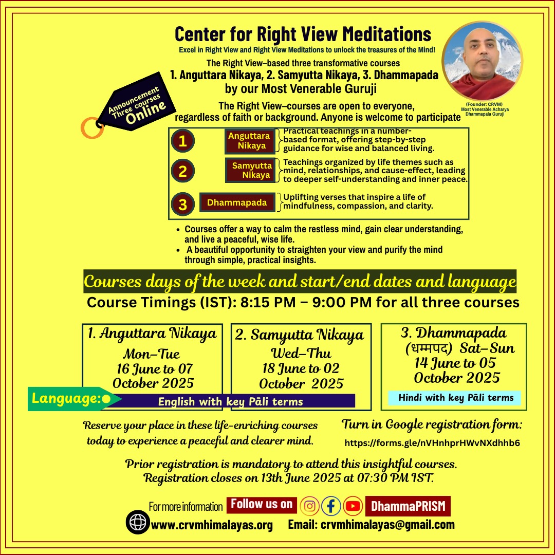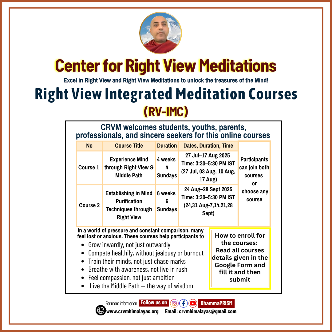 (Course1:Experience Mind through Right View & Middle Path 4 weeks- 27Jul-17Aug 25) and (Course 2:Establishing Mind Purification Techniques through Right View 6 weeks -24Aug-28Sept 25)